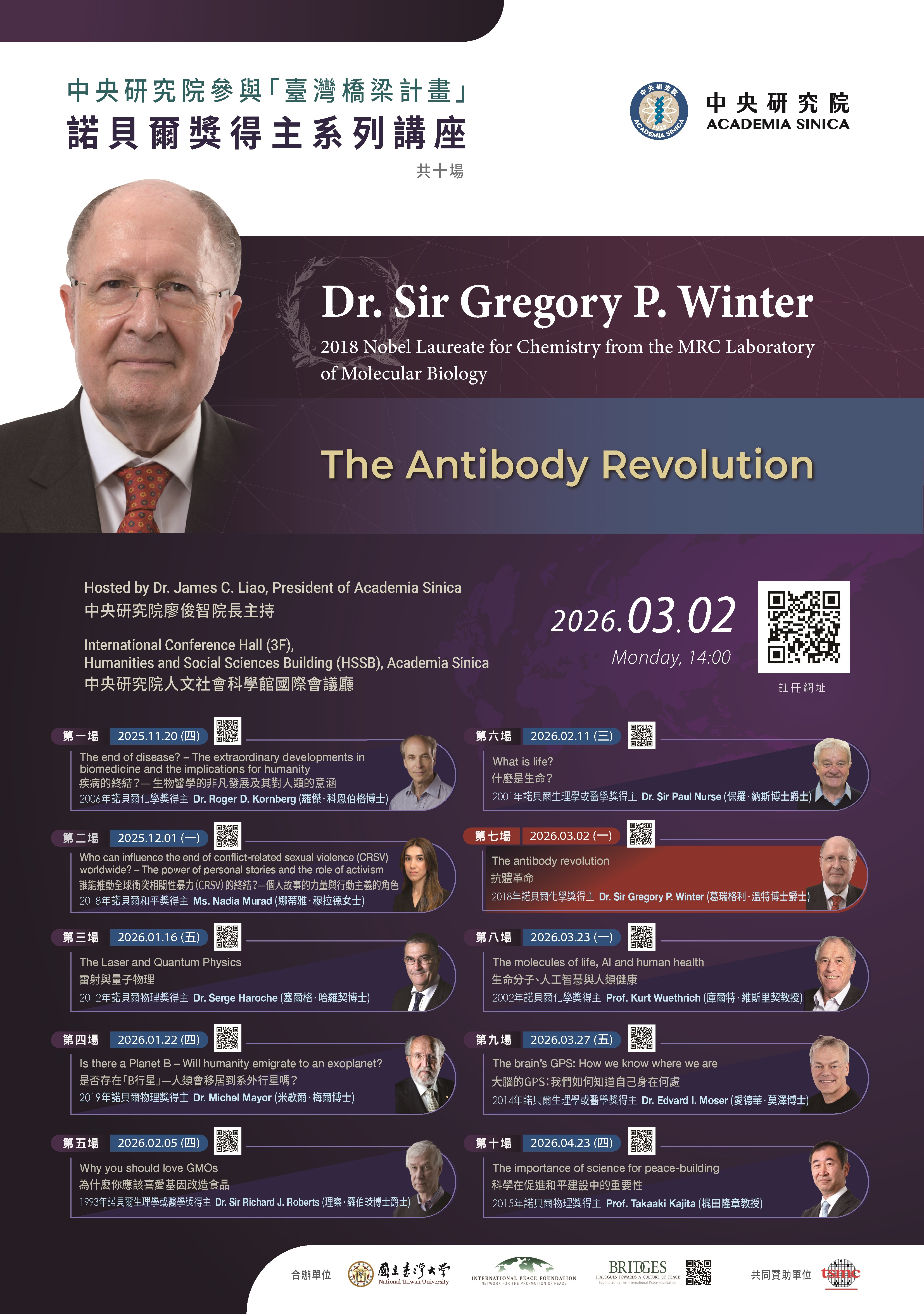 | 公告內容 | 說明: 一、「臺灣橋梁計畫」自114年11月起至本115年4月,共將邀請31位諾貝爾獎得主訪問本院及全臺十餘所大學,相關資訊請參閱網站:https://www.peace-bridges.net/。 二、本院將邀請其中10位蒞院演講與交流,第七場演講資訊如下: (一)時間:115年3月2日(星期一)下午2時整 (二)地點:本院人文社會科學館國際會議廳 (三)講題:The Antibody Revolution(抗體革命) (四)檢附演講海報電子檔1份。 (五)報名網址:https://forms.gle/NsUpyfiodnVvC92A7。 (六)洽詢專線:本院國際事務處張先生,(02)27899895。 |