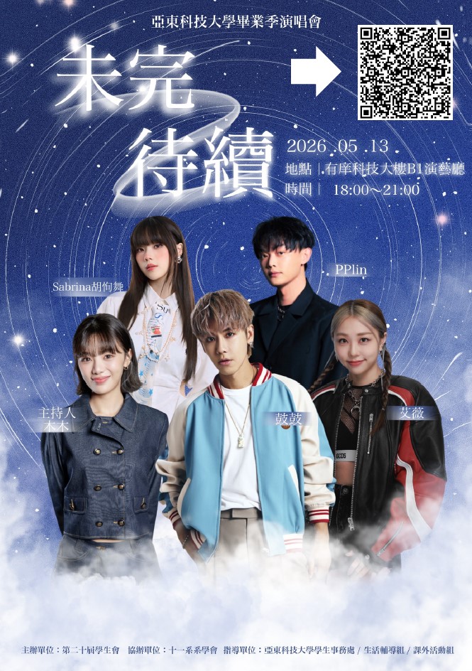 校園公告 公告主旨 亞東科技大學辦理「反毒畢業音樂演唱會 《 未完待續》」 發佈日期 2026 年 4 月 24 日 發佈單位 教官室 公告類別 學生專區, 行政公告 公告等級 轉知 點閱次數 195 公告內容 音樂演唱會相關訊息如下: (一)演出時間:115年05月13日 (星期三)晚上6:00 (二)演出地點:有庠科技大樓B1演藝廳1B101(地址:新北市板橋區四川路二段58號) (三)報名請至亞東科技大學學生會google表單(https://forms.gle/ZTGQ8quoccuyAzyT6) (四)活動詳情請參考亞東科技大學學生會IG公告,網址如下(https://www.instagram.com/aeustsa_20th?igsh=d2k5bWdraDdiMjRk) 相關附件 亞東科技大學校安中心 杜絕藥物濫用海報 亞東科技大學校安中心 杜絕藥物濫用海報 檔案名稱檔案大小檔案格式下載亞東科技大學校安中心 杜絕藥物濫用海報.pdf367.00 KB新視窗開啟檔案亞東科技大學反毒畢業音樂演唱會《 未完待續》海報.pdf369.45 KB新視窗開啟檔案 亞東科技大學校安中心 杜絕藥物濫用海報.pdf亞東科技大學反毒畢業音樂演唱會《 未完待續》海報.pdf 相關連結 亞東科技大學學生會google表單 亞東科技大學學生會IG 【2026-04-24】國立臺東高級中學辦理「115年度全國公私立高級中等學校原住民文 ... 【2026-04-24】臺北市立松山工農辦理臺北市機器人技術教學中心114學年度第2學期 ...