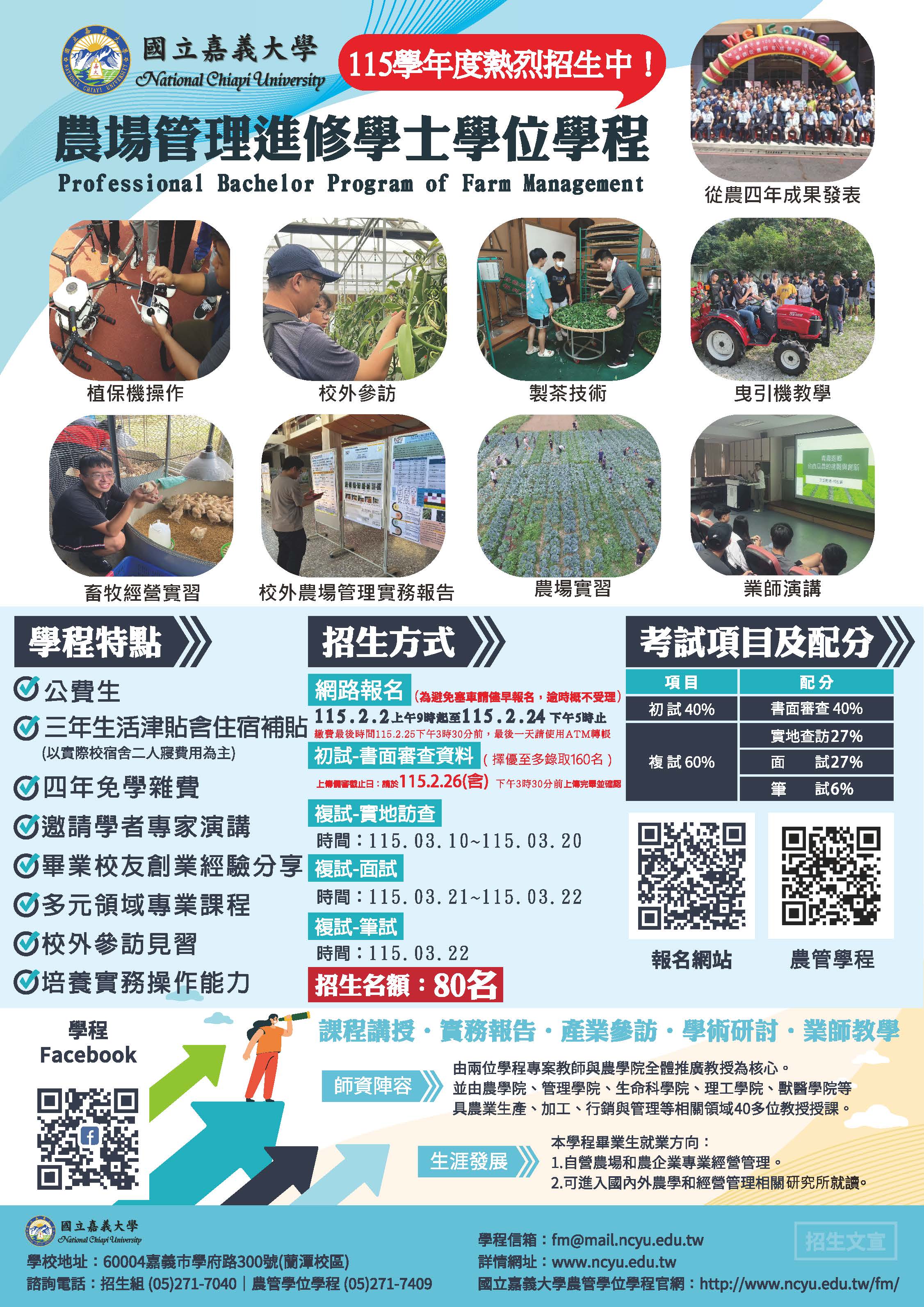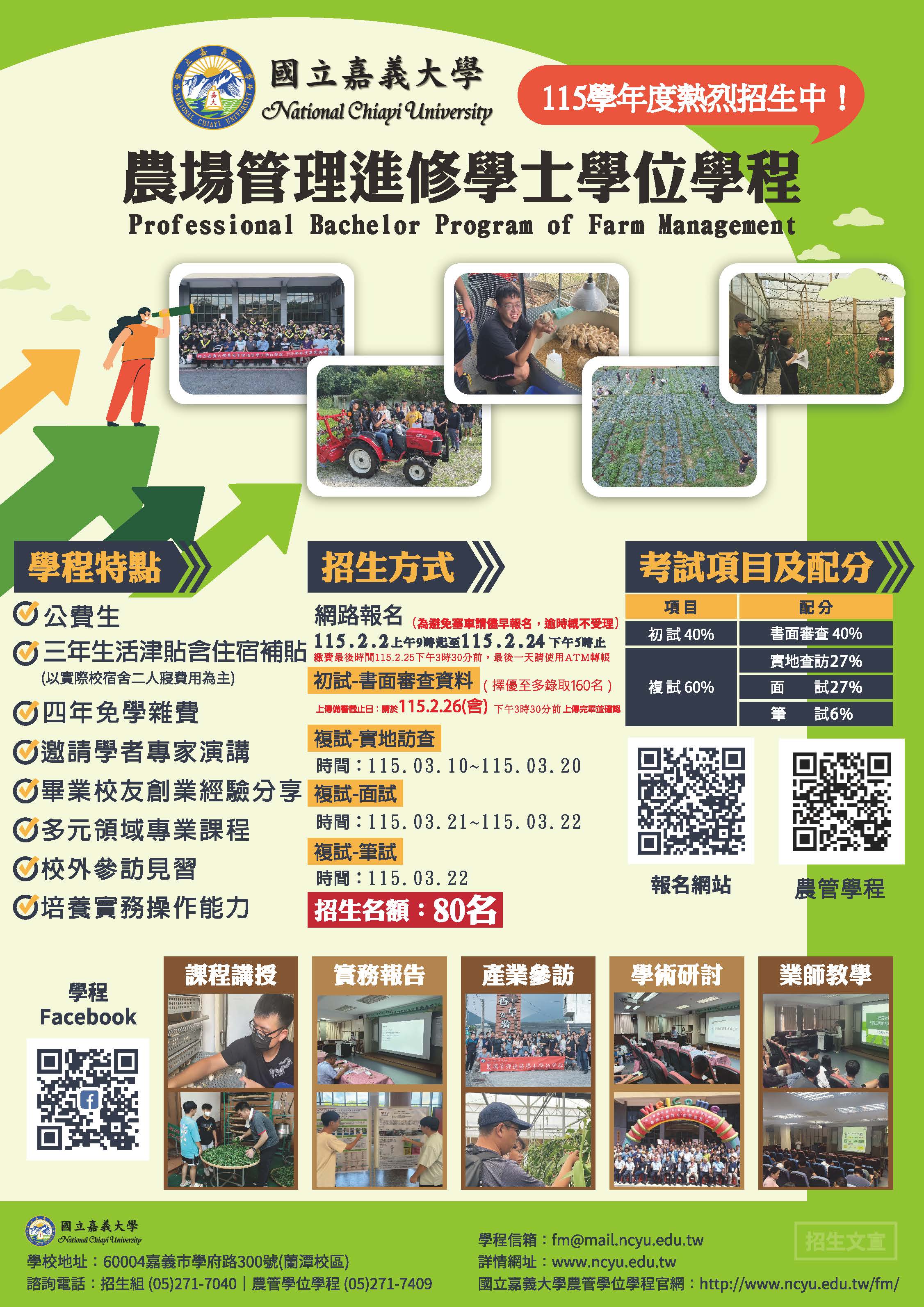 | 公告主旨 | 國立嘉義大學農場管理進修學士學位學程115學年度農業公費專班招生資訊 |