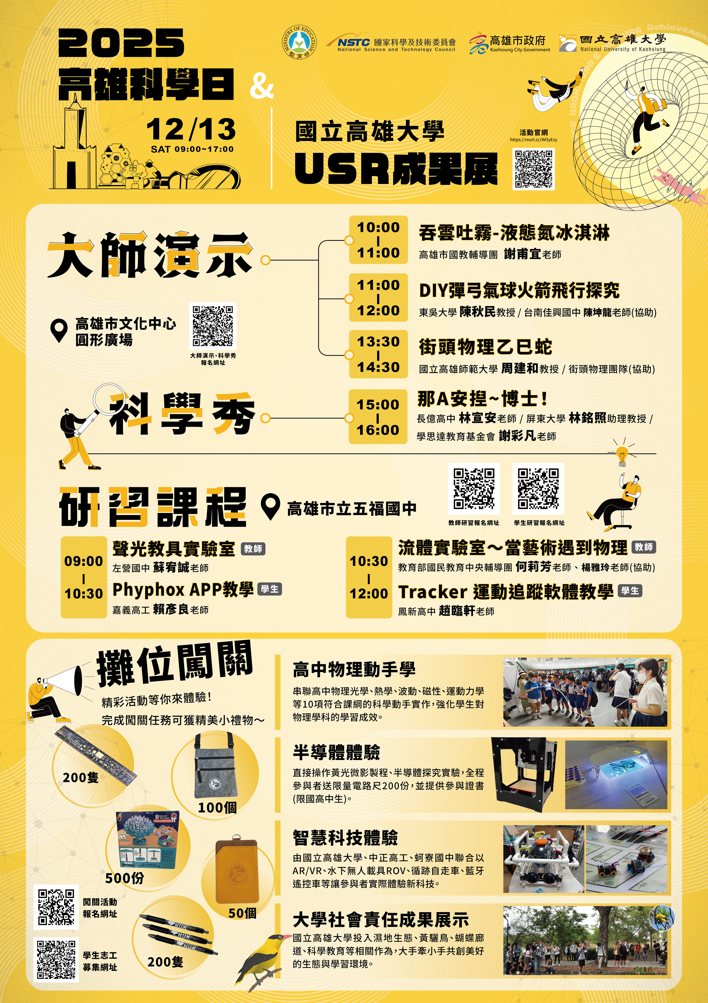 | 公告內容 | 說明: 一、為推廣科學教育與分享本校師生執行USR計畫豐碩成果,辦理成果展,透過大師演示、科學秀、大眾科普、半導體製程體驗、智慧科技體驗,及教師與學生研習,以擴大各界交流。 二、活動時間:114年12月13日(星期六)9:00-17:00。 三、活動地點:高雄市文化中心圓形廣場、高雄市立五福國中。 四、隨函檢附活動海報、活動行程及資訊等。 五、報名方式及更多資訊詳活動官網:https://reurl.cc /EbpVlA 六、聯絡方式:本校科學教育中心許助理,電話:(07) 5919000分機7729 |
