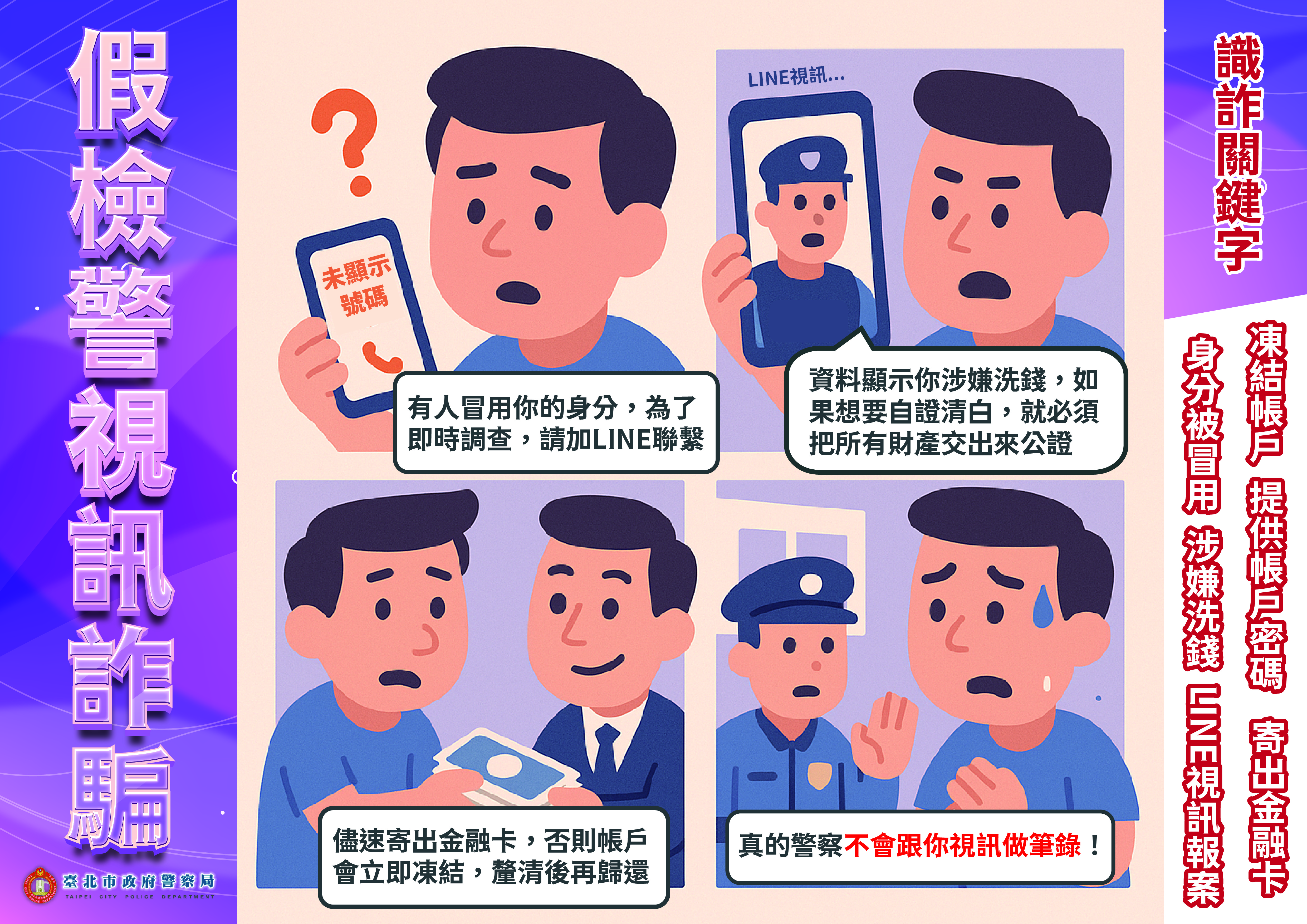 - 近期發現詐騙集團常用「假檢警視訊」、「二次詐騙」等 方式,誘導民眾匯款或轉帳,另行政院現正推動「全民普 發現金」政策全民普發現金,政府不會發簡訊或電子郵件要求登錄,更不會要求操作ATM或網銀,不點擊、不填輸、不匯款、不轉傳!