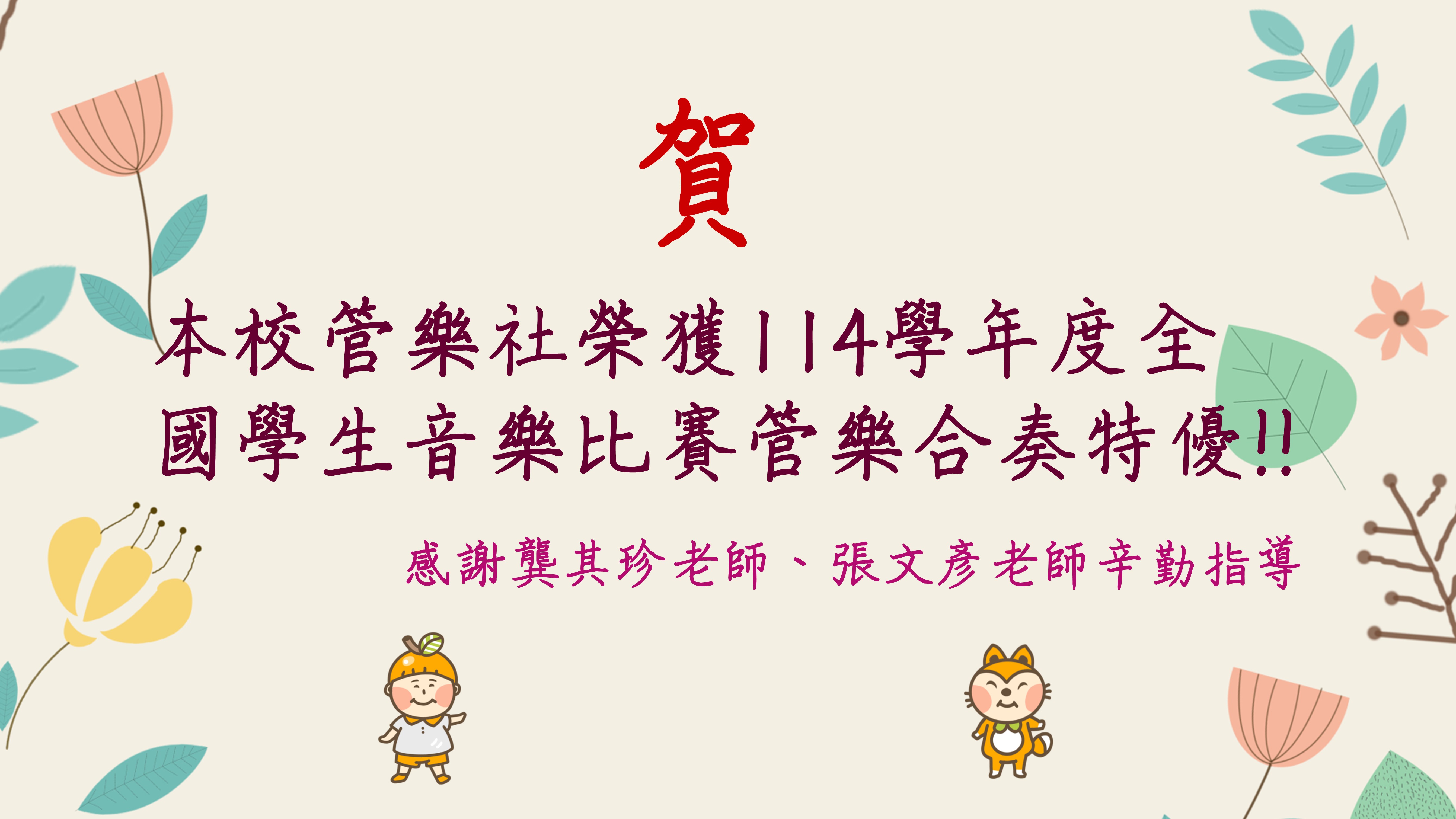校園公告 公告主旨 本校管樂社榮獲114學年度全國學生音樂比賽管樂合奏特優!!感謝龔其珍老師、張文彥老師辛勤指導 發佈日期 2026 年 3 月 06 日 發佈單位 訓育組 公告類別 學生專區, 行政公告, 榮耀南湖 公告等級 狂賀 點閱次數 202 公告內容 相關附件 【2026-03-06】教育部國民及學前教育署推動高級中等學校學生學習歷程檔案115 年 ... 【2026-03-06】臺北市特殊教育地方輔導團資賦優異類分團臺北市 114學年度第2學 ...
