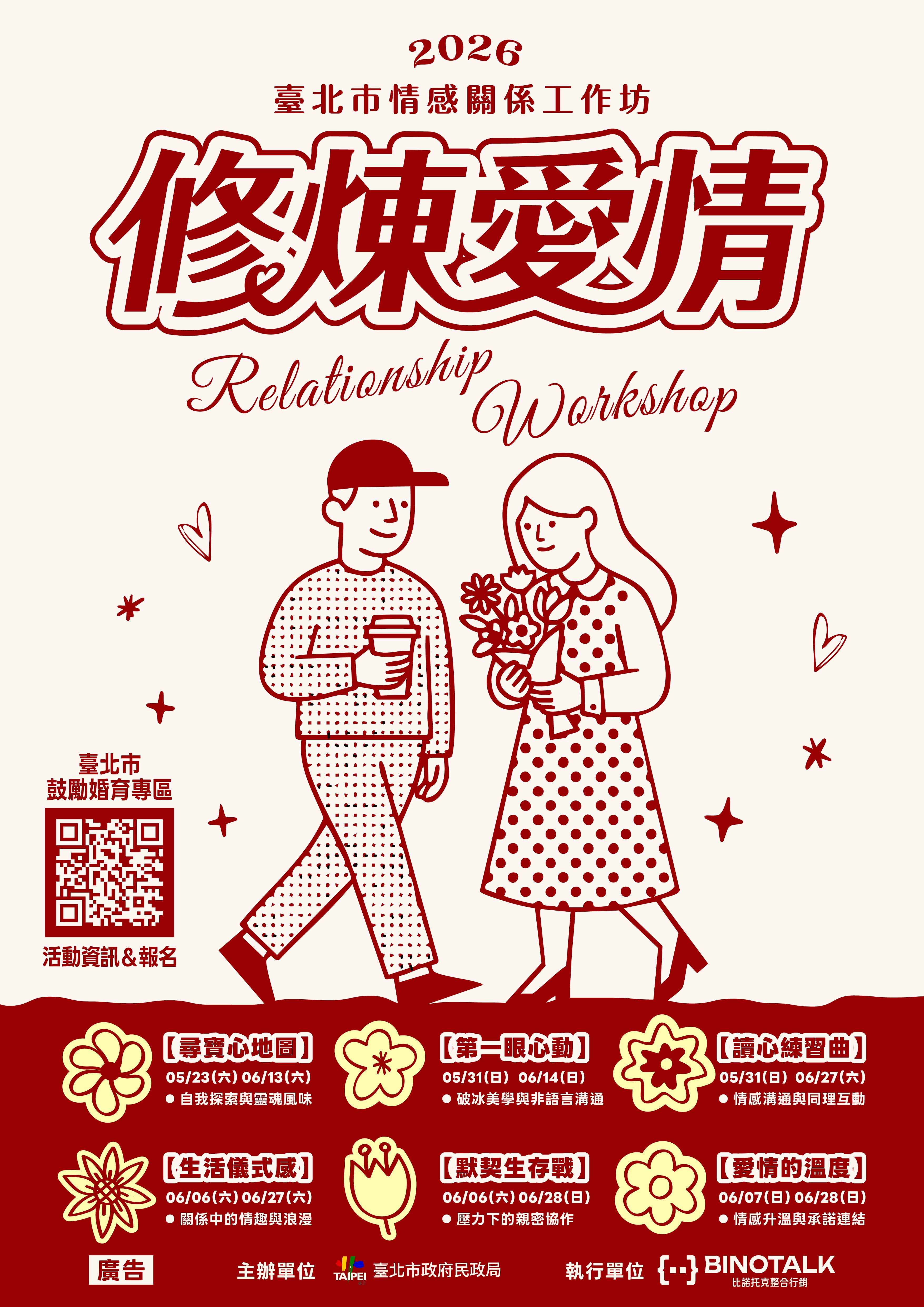 校園公告 公告主旨 臺北市政府民政局辦理「115年情感關係工作坊」 發佈日期 2026 年 4 月 16 日 發佈單位 輔導室 公告類別 行政公告 公告等級 轉知 點閱次數 31 公告內容 2026臺北市情感關係工作坊4/16開放報名囉! 5/23至6/28共12場豐富主題,學習愛情溝通,還可體驗風味調飲、香氛調製,機會難得、把握機會報名!詳情見「臺北市鼓勵婚育專區」(https://loveactually.gov.taipei/)。 相關附件 【2026-04-16】國立臺灣師範大學辦理「114至115學年度英語自主檢測系統內容研發 ... 【2026-04-16】2026中國醫藥大學杏服醫學服務隊暑期營高中生隊員招募活動