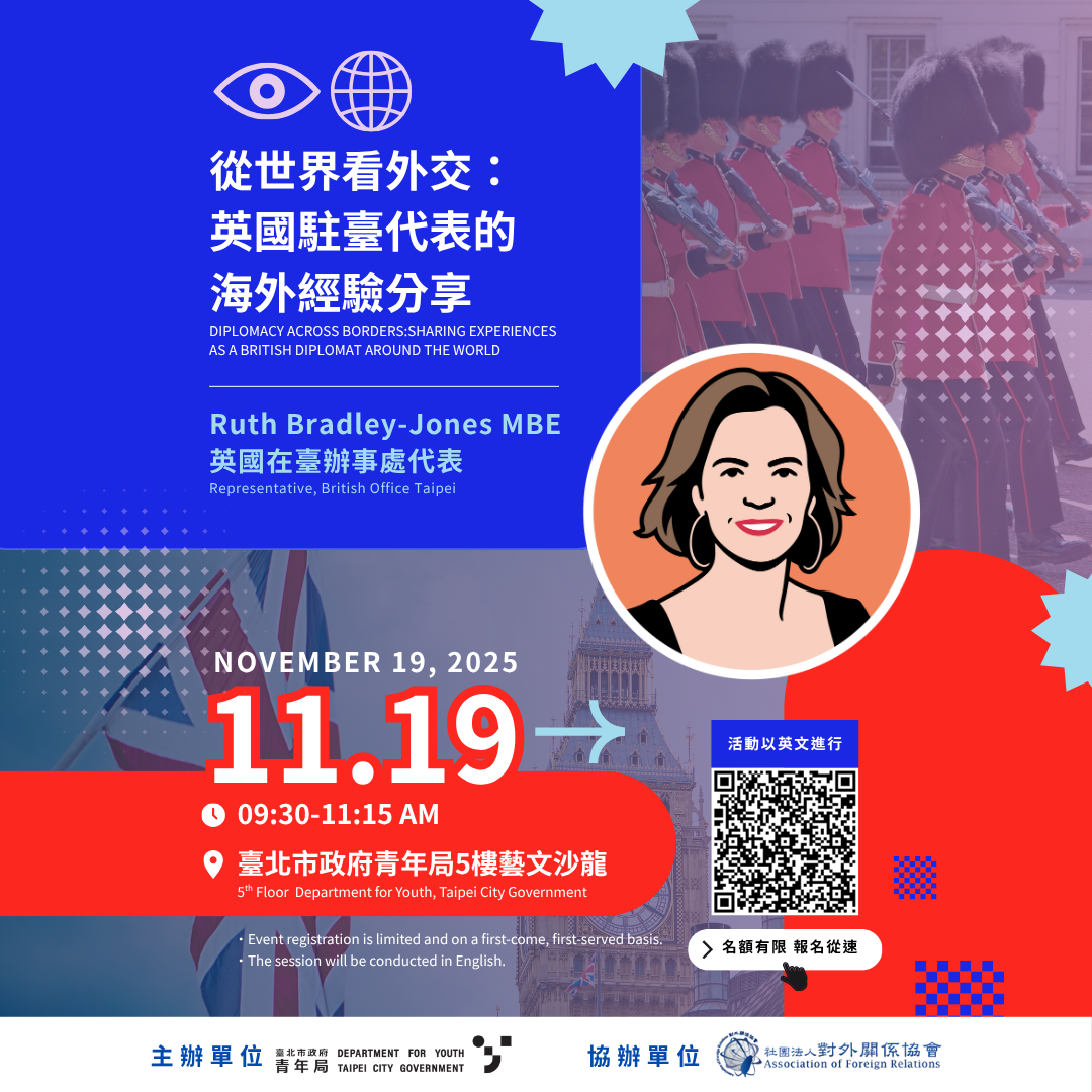 | 公告主旨 | 臺北市政府青年局辦理「從世界看外交:英國駐臺代表的海外經驗 分享/Di pl omacy Across Borders: Sharing Experi ences as a Bri ti sh Di pl omat Around the World」講座 |