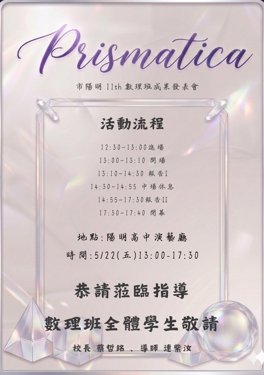 | 公告內容 | 說明: 一、本校第十一屆數理科學班成果發表會主題:Prismatica。 二、時間:115年5月22日(星期五)12:30入場、13:30正式開始。 三、地點:本校活動中心一樓演藝廳。地址:臺北市士林區中正路510號。 四、敬請欲報名單位於115年5月8日(星期五)前至表單 (https://forms.gle/J91V31LKJRUv4arb7)填寫相關資料,以利安排座位。 |