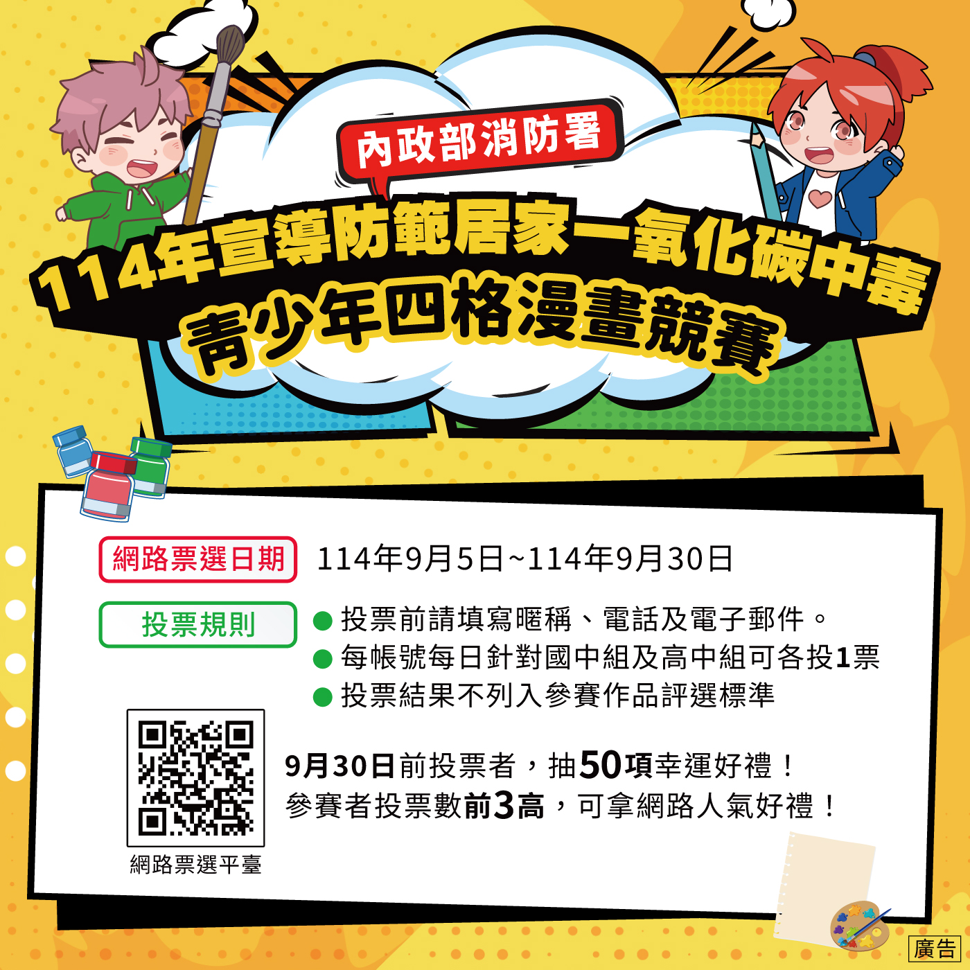 校園公告 公告主旨 轉內政部消防署「114年宣導防範居家一氧化碳中毒青少年四格漫畫競賽」網路票選活動 發佈日期 2025 年 9 月 15 日 發佈單位 教官室 公告類別 學生專區, 活動競賽 公告等級 轉知 點閱次數 376 公告內容 相關附件 相關連結 內政部消防署_活動首頁 【2025-09-15】文藻外語大學辦理「114年度第十六屆文藻盃全國高中職日文朗讀比賽」 【2025-09-15】臺北市114 學年度教育盃中小學高爾夫錦標賽相關訊息公告