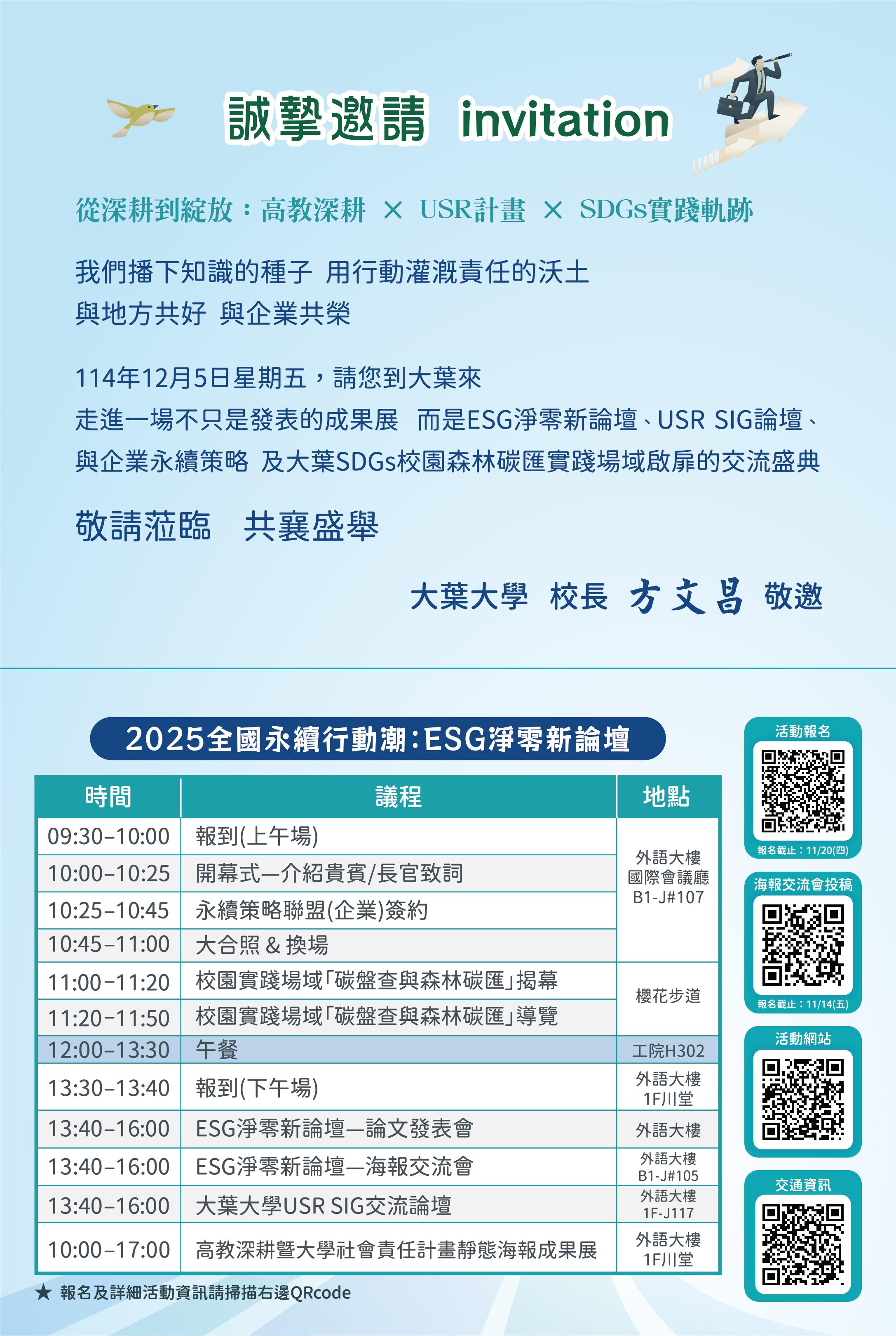 校園公告 公告主旨 轉知大葉大學「2025全國永續行 動潮:ESG淨零新論壇」議題進行徵稿 發佈日期 2025 年 11 月 04 日 發佈單位 衛生組 公告類別 學生專區 公告等級 轉知 點閱次數 10 公告內容 相關附件 徵稿說明 徵稿說明 檔案名稱檔案大小檔案格式下載徵稿說明.pdf382.63 KB新視窗開啟檔案 徵稿說明.pdf 成果發表會活動內容 成果發表會活動內容 檔案名稱檔案大小檔案格式下載成果發表會活動內容.pdf1.07 MB新視窗開啟檔案 成果發表會活動內容.pdf 邀請卡 邀請卡 檔案名稱檔案大小檔案格式下載邀請卡.jpg687.00 KB新視窗開啟檔案 邀請卡.jpg 【2025-11-04】財團法人語言訓練測驗中心辦理「全民英檢」(GEPT)新年度初級、 ... 【2025-11-04】國立臺灣師範大學師資培育學院辦理師資培育之大學社會責任實踐計 ...