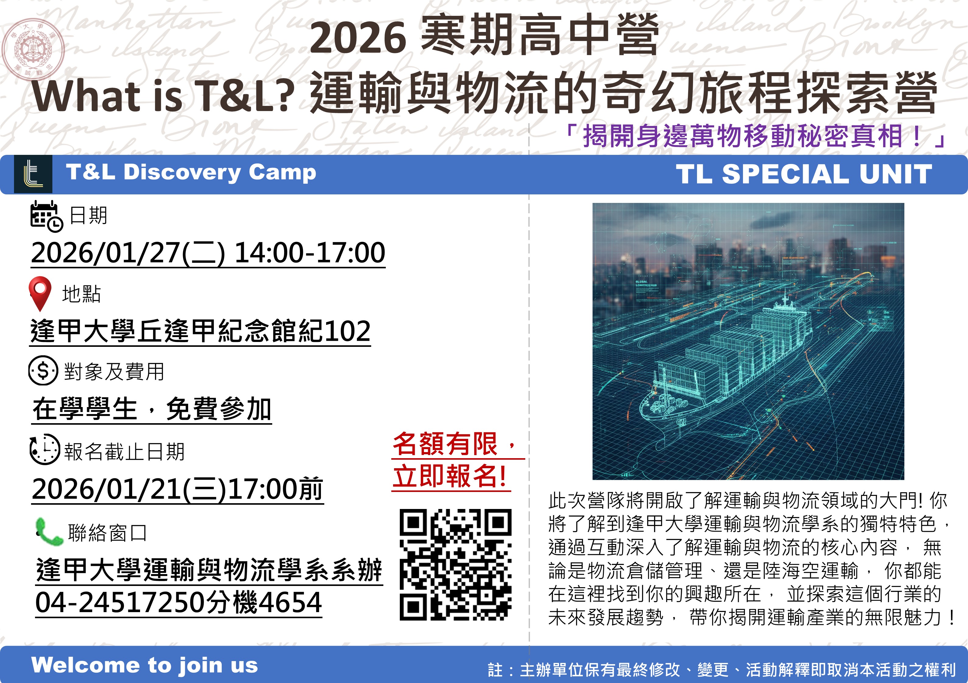 校園公告 公告主旨 逢甲大學運輸與物流學系謹訂於115年1月27日辦理「What is T&L? 運輸與物流的奇幻旅程探索營」 發佈日期 2025 年 12 月 23 日 發佈單位 輔導室 公告類別 學生專區, 行政公告, 活動競賽 公告等級 轉知 點閱次數 15 公告內容 一、旨揭營隊涵蓋多個課程,包含物流倉儲管理、陸海空運輸等,旨在讓學員透過有趣的互動,了解學系的特色並探索行業的未來發展趨勢。 二、活動時間:115年1月27日(星期二)下午2時至5時整。 三、活動地點:逢甲大學丘逢甲紀念館一樓紀102。 四、招收對象:全國高級中等學校學生。 五、活動費用:免營隊費用。 六、報名網址:https://forms.gle/DpHTTrNHM9RRpfu49,請參閱活動海報。 七、報名時間:即日起至115年1月21日(星期三)下午5時整。 相關附件 【2025-12-23】國立自然科學博物館訂於115年1月27、28、29日與中山醫學大學合辦 ... 【2025-12-23】世新大學英語暨傳播應用學系辦理「2026高中英語傳播體 驗營」