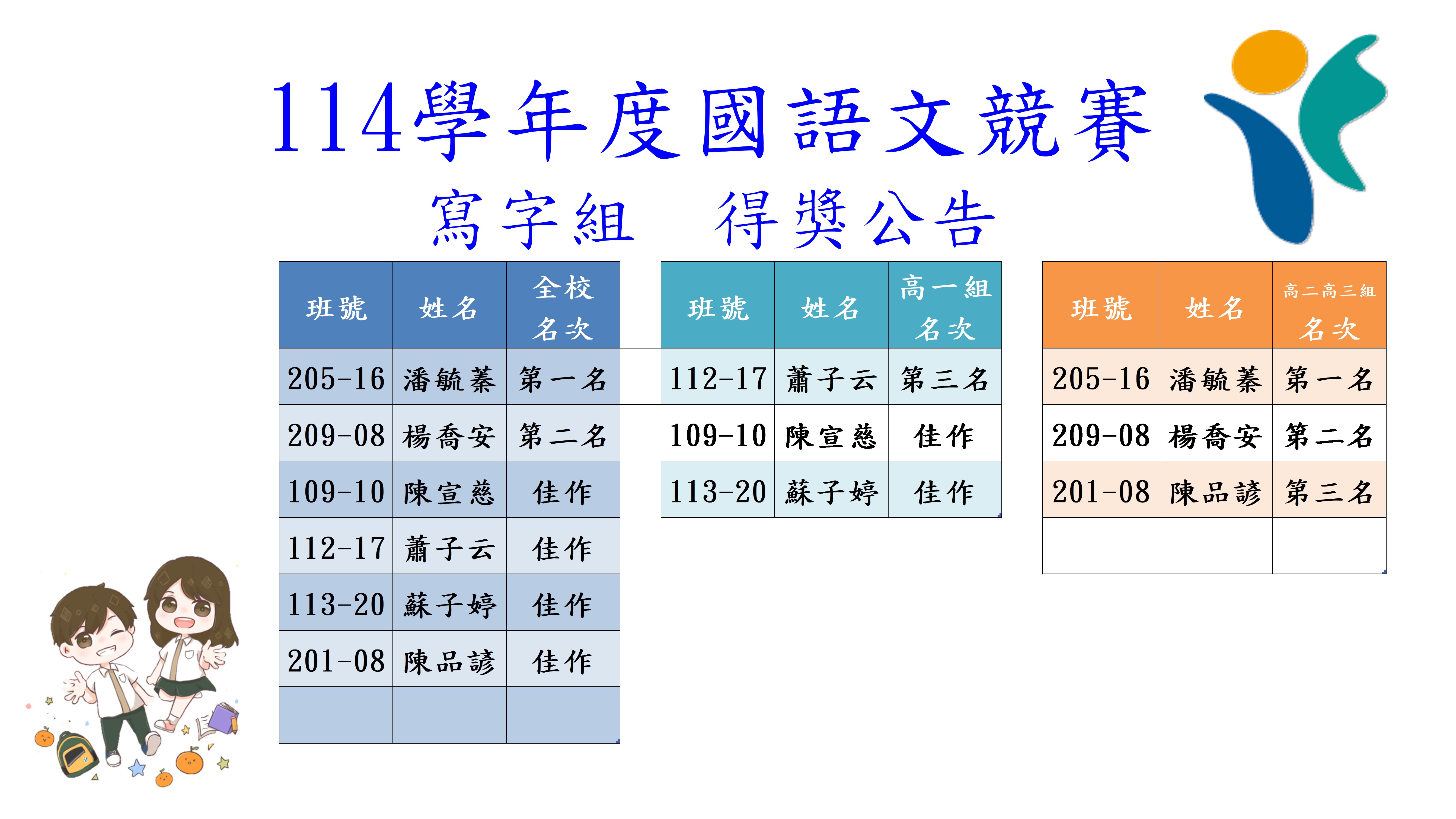 校園公告 公告主旨 114學年度國語文競賽寫字組得獎公告 發佈日期 2025 年 12 月 18 日 發佈單位 教學組 公告類別 行政公告, 榮耀南湖 公告等級 狂賀 點閱次數 35 公告內容 相關附件 【2025-12-18】臺北城市科技大學辦理2026城市科大數媒系 動畫、遊戲、影視、 AI ... 【2025-12-18】114學年度國語文競賽字音字形組得獎公告