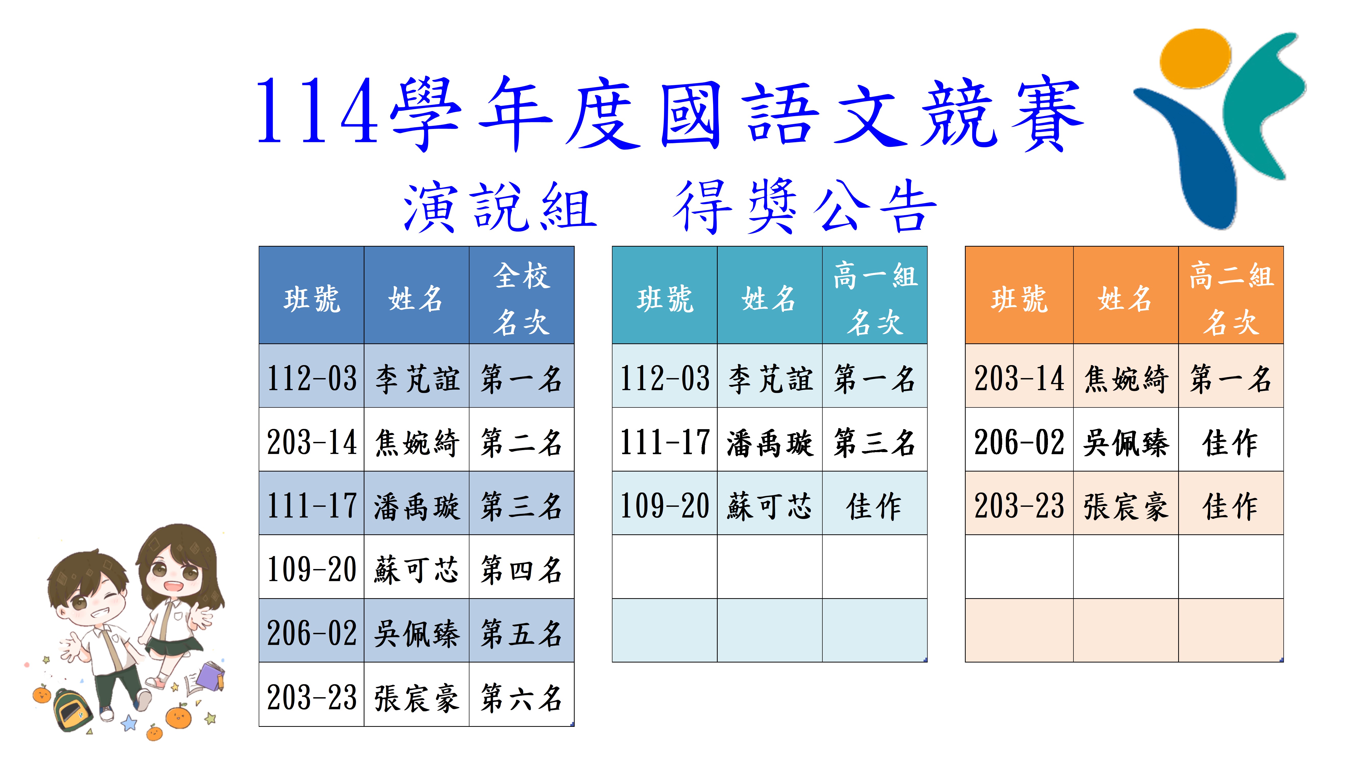 校園公告 公告主旨 114學年度國語文競賽演說組得獎公告 發佈日期 2025 年 12 月 18 日 發佈單位 教學組 公告類別 行政公告, 榮耀南湖 公告等級 狂賀 點閱次數 32 公告內容 相關附件 【2025-12-18】114學年度國語文競賽朗讀組得獎公告 【2025-12-18】國立屏東大學教育學系辦理「2026年【育夢同行】高中生科系探索營隊」