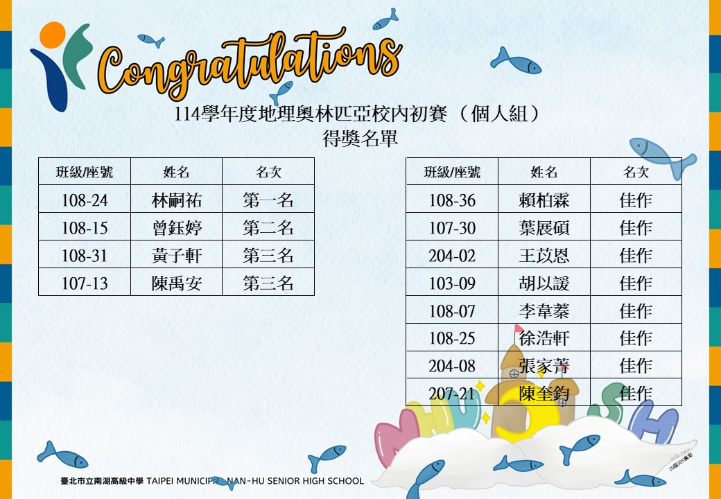 校園公告 公告主旨 114學年度地理奧林匹亞競賽(個人組)校內初賽得獎名單 發佈日期 2026 年 4 月 23 日 發佈單位 教學組 公告類別 行政公告, 榮耀南湖 公告等級 狂賀 點閱次數 20 公告內容 相關附件 【2026-04-23】章亞若教育基金會單親清寒獎學金 【2026-04-23】勞動力重建運用處辦理「身心障礙者就業準備小教室」