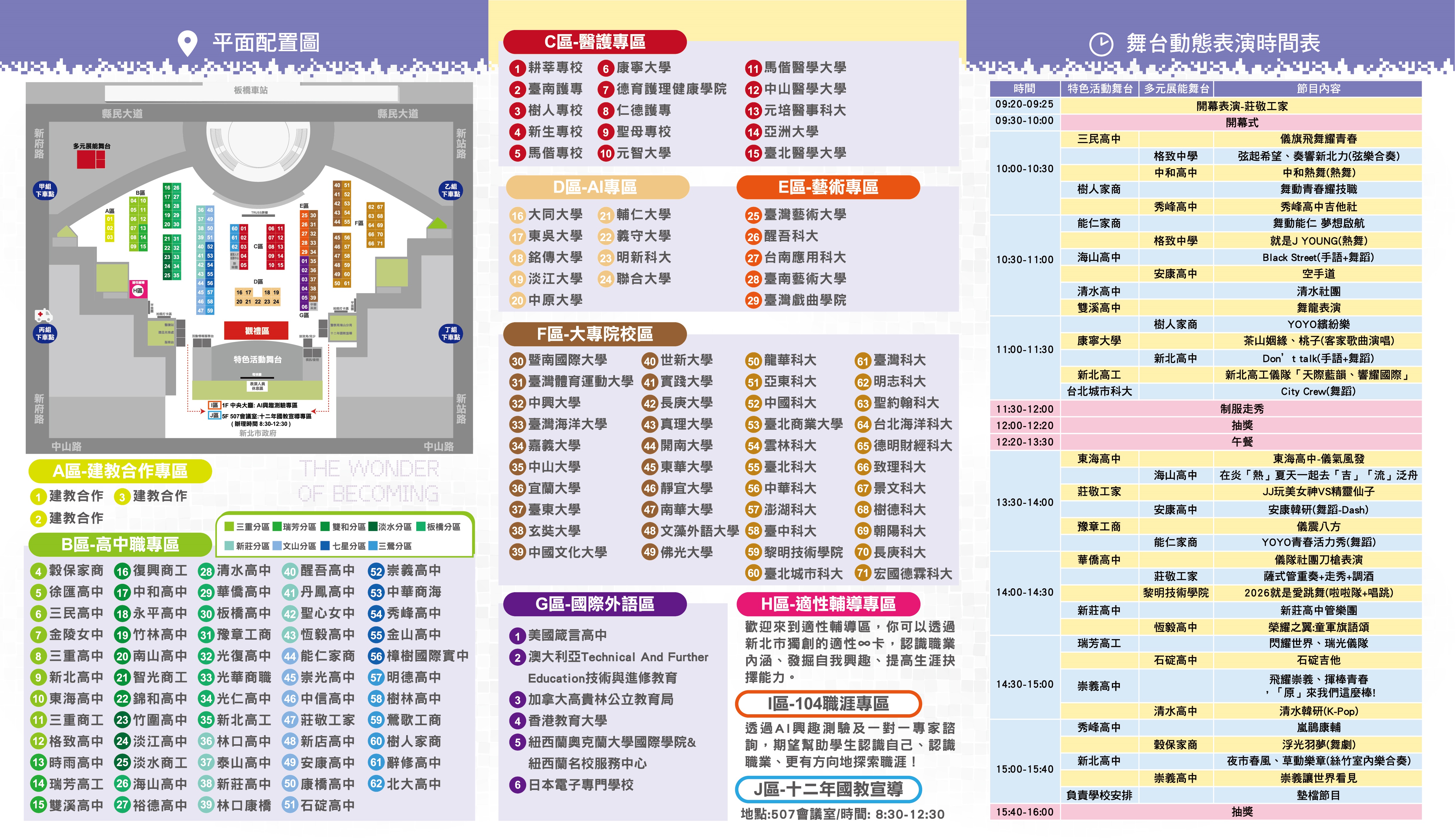 二、本次博覽會擴大邀請全國71所大專院校及60所新北市優質高中職學校參與,共有超過130所學校特色課程體驗,並設有十大專區體驗,涵蓋建教合作專區、高中職專區、醫護專區、AI專區、藝術專區、大專院校專區、國際外語專區、適性輔導專區、104職涯專區及十二年國教宣導專區等,另安排超過30個精彩的表演節目,歡迎北北基桃國高中學生及家長來現場參加,瞭解新北市優質高中職學校及大專院校特色。