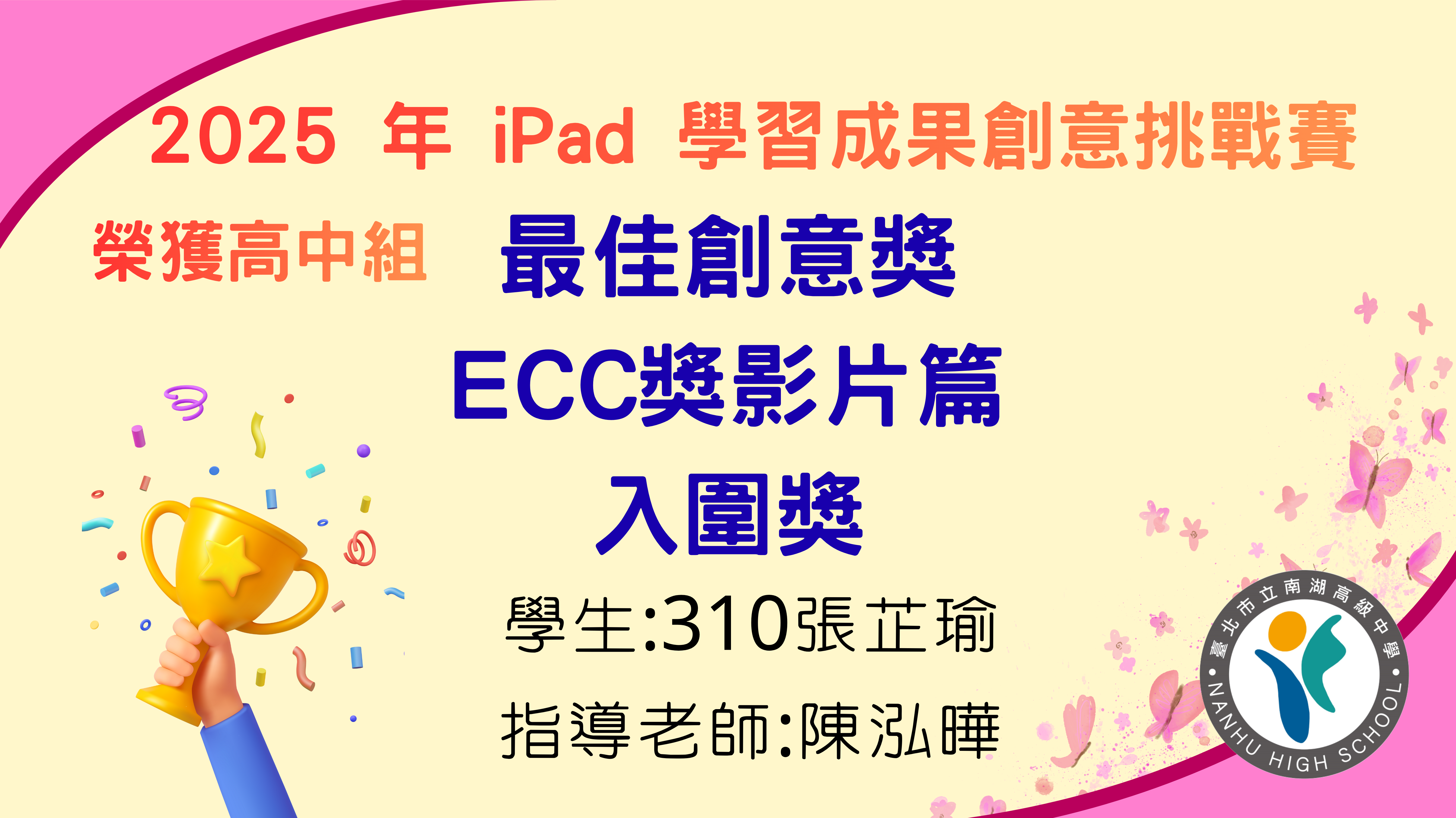 校園公告 公告主旨 31008 張芷瑜參與2025年iPad學習成果創意挑戰賽 榮獲高中組 最佳創意獎、ECC獎影片篇、入圍獎 發佈日期 2025 年 11 月 20 日 發佈單位 圖書館 公告類別 榮耀南湖 公告等級 狂賀 點閱次數 15 公告內容 相關附件 【2025-11-20】正修科技大學115年度「寒假探索冬令營」活動訊息